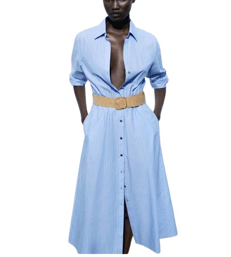 Robe chemise midi rayée bleu clair avec manches longues, col chemise classique, boutons frontaux et ceinture contrastante. Élégante, tendance et facile à porter au quotidien.